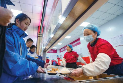 渭南初级中学食堂工作人员为学生打餐。彭一鹏 摄